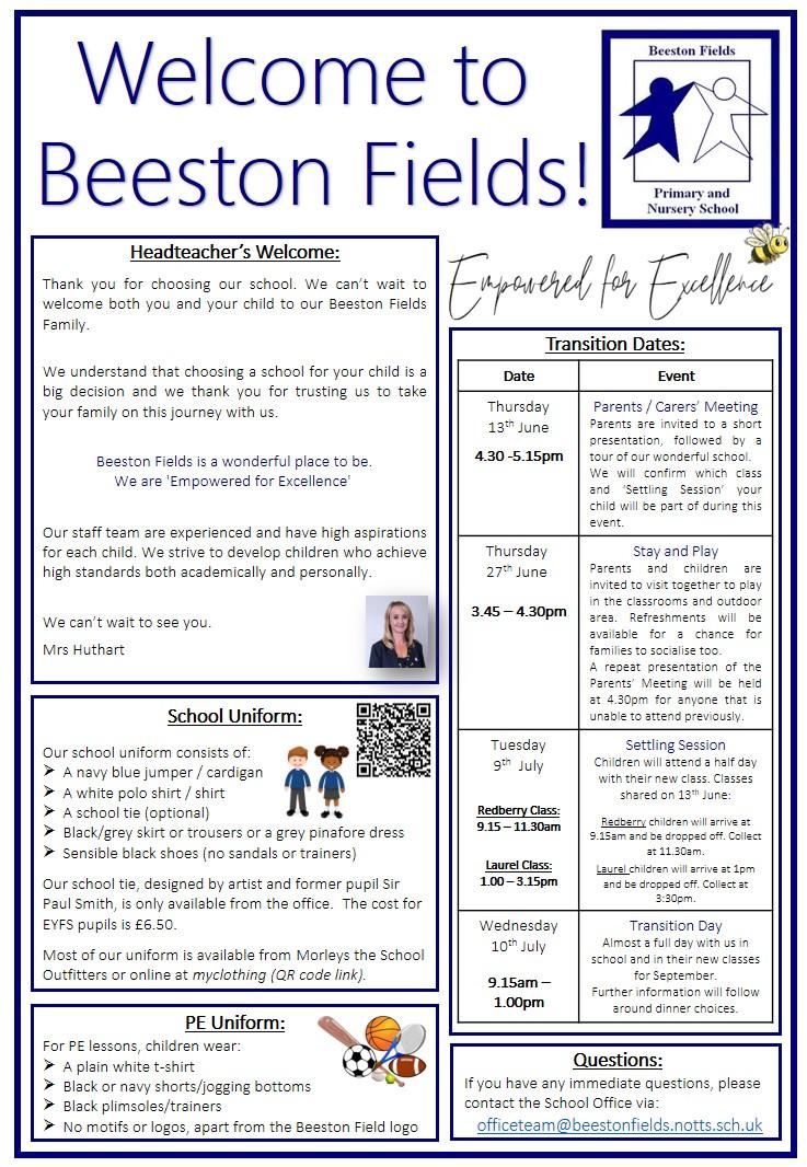 We are thrilled that have chosen Beeston Fields Flying High Academy as your child's school for September 2024. Please review the arrangements for this year's admissions into Reception on the poster below: