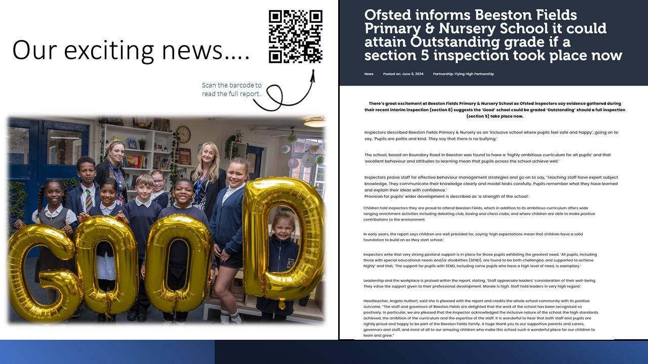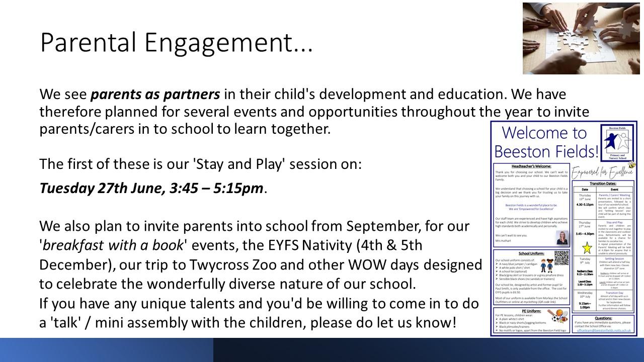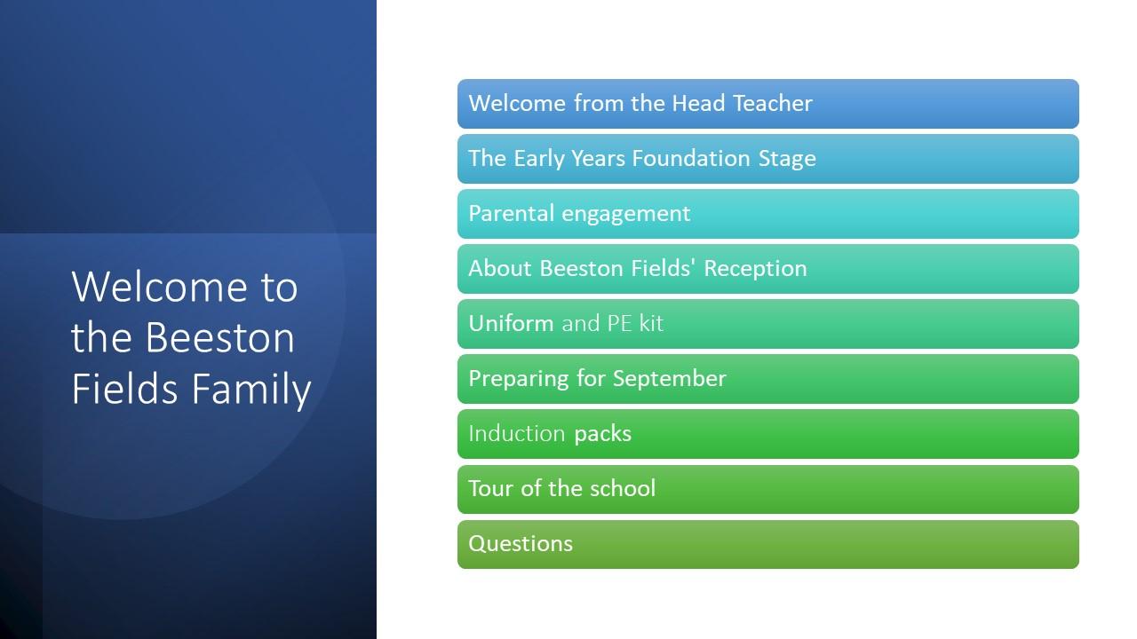 A copy of the presentation delivered to parents/carers on 13th June 2024 can be found here. It contains important information about your child starting Reception in September 2024. Should you require any additional information, please email us via officeteam@beestonfields.notts.sch.uk.