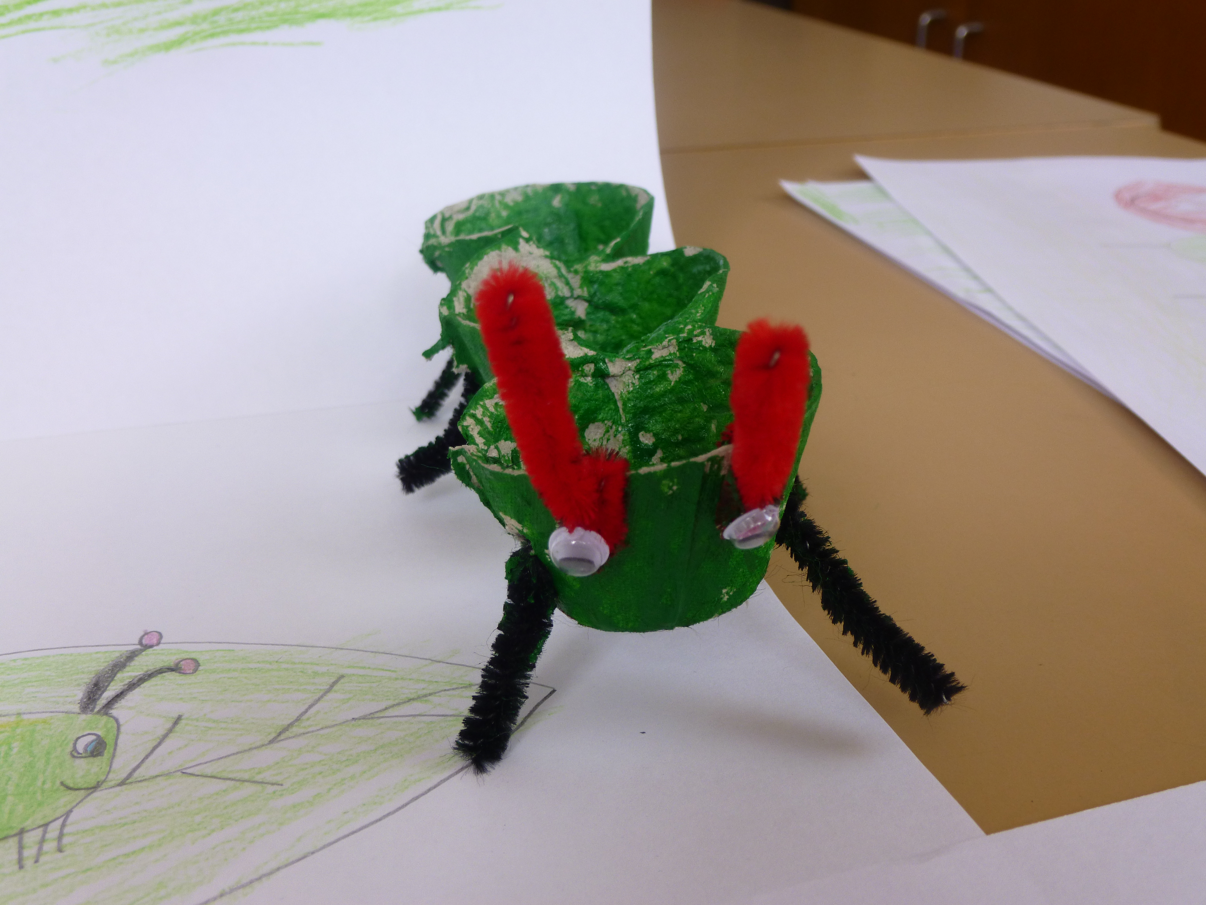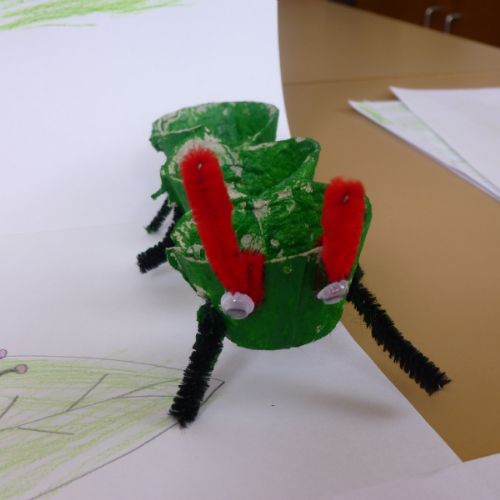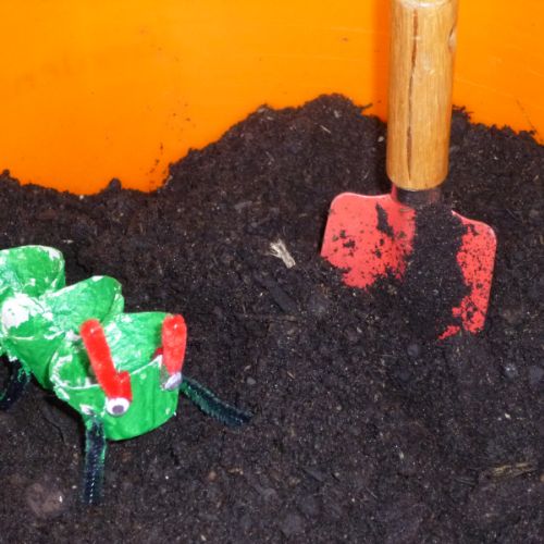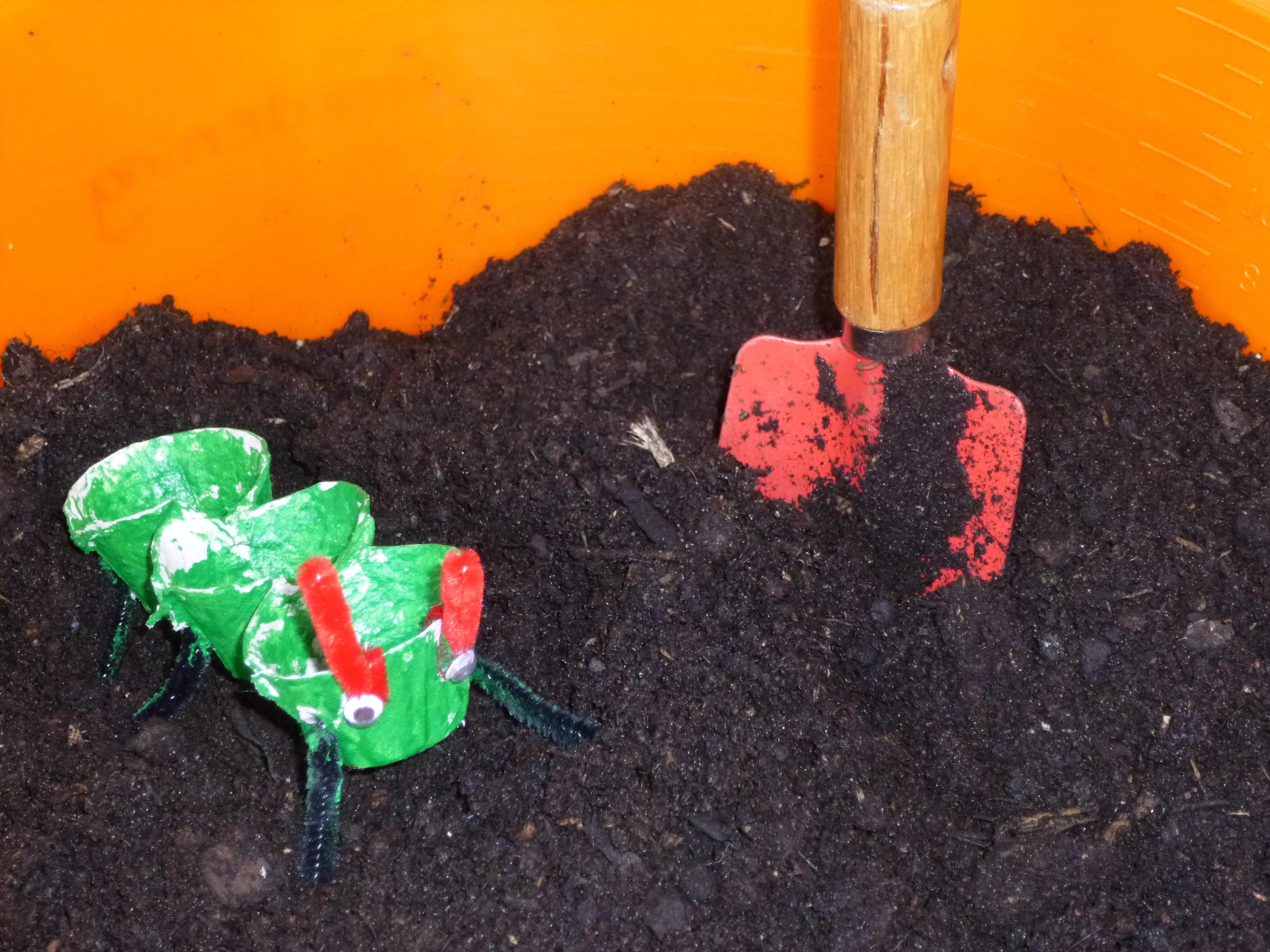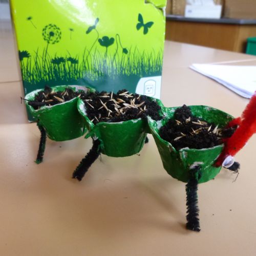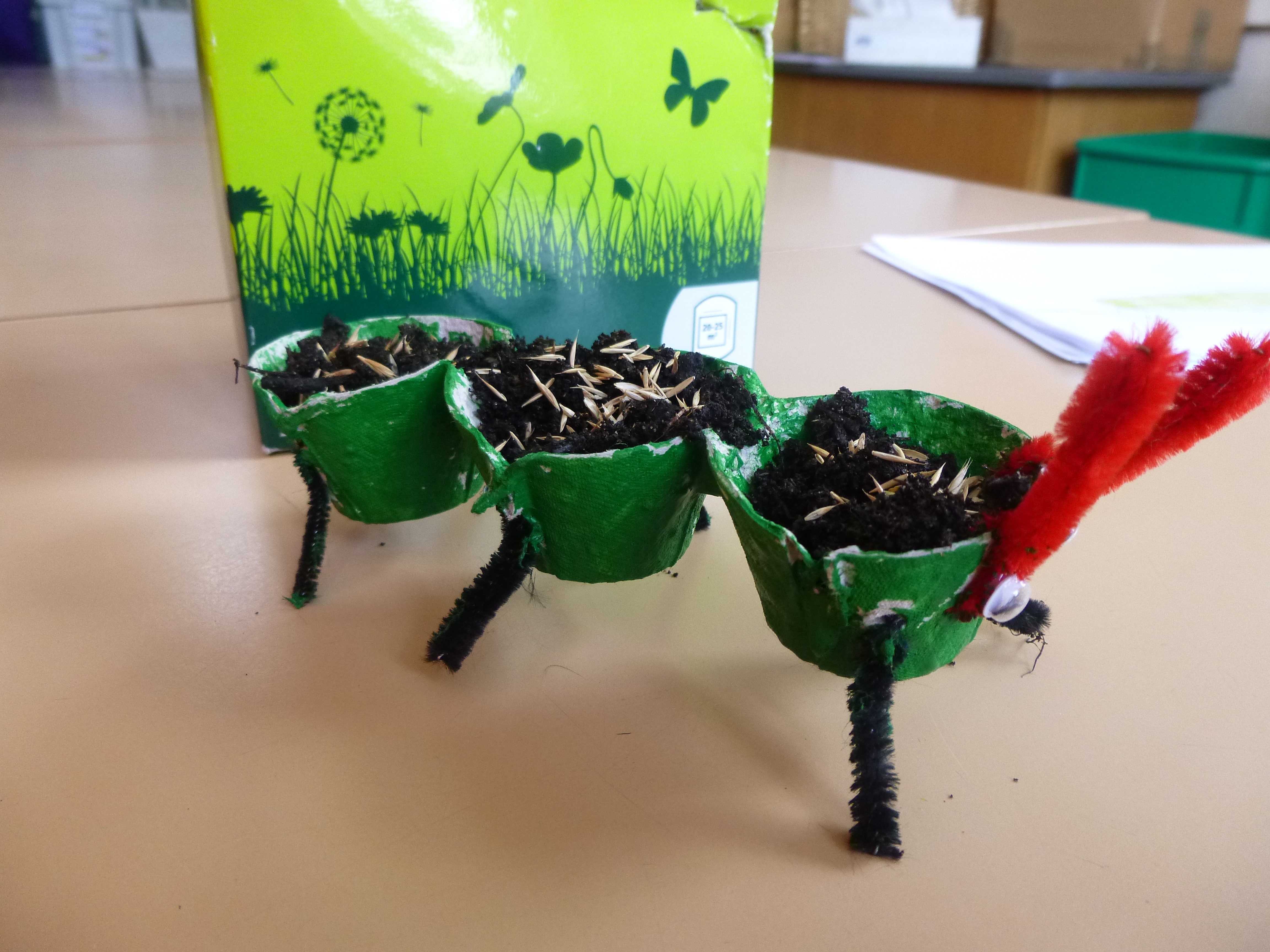In Gardening Club we made grass Caterpillars from egg boxes, compost and grass seed.
